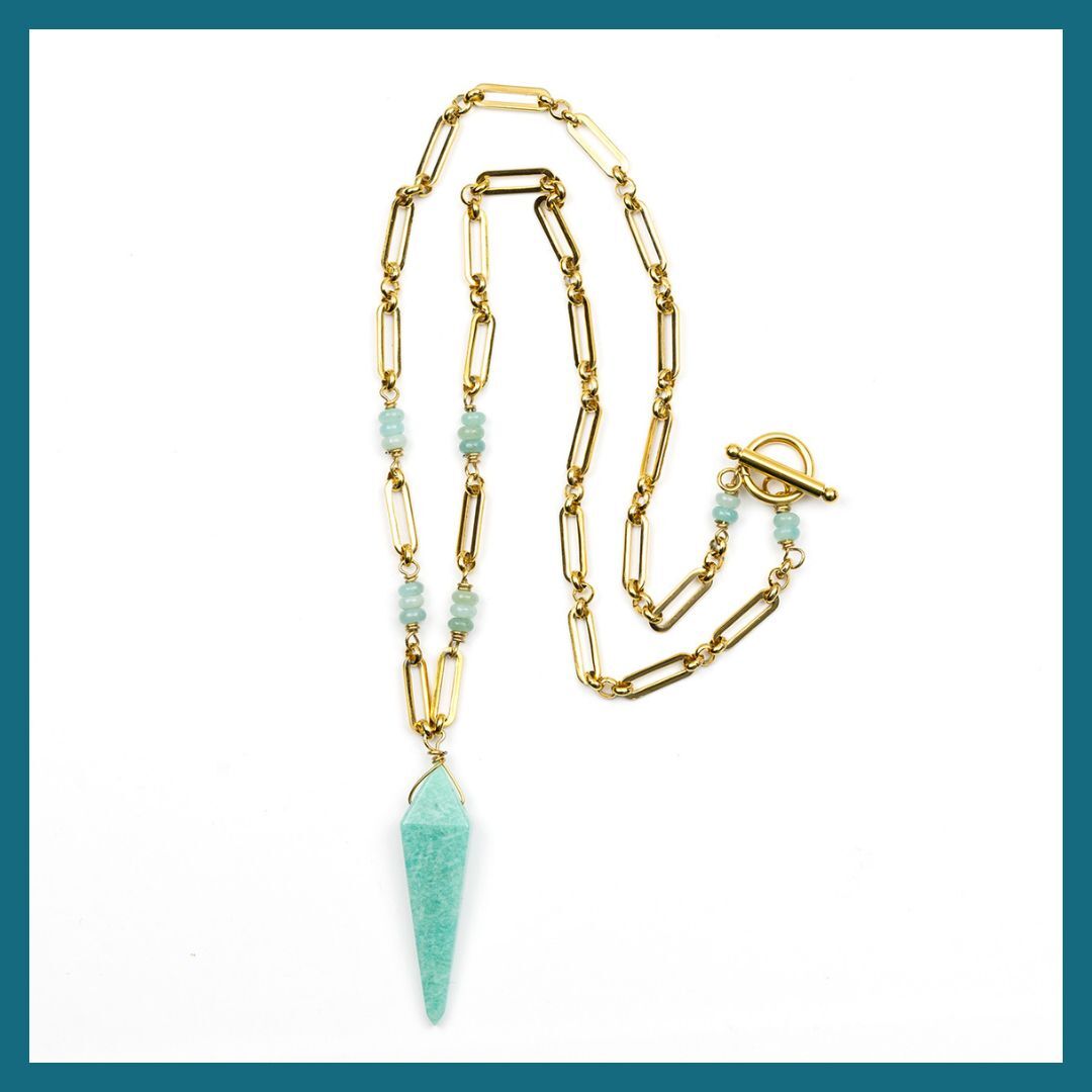 The Gemstone Kite Necklace features a sleek, faceted gemstone pendant in a modern kite shape, paired with bold metal chain links for a balanced mix of natural beauty and contemporary style. Each necklace design showcases a gemstone’s natural color and texture, suspended from elegant chain detail for an effortlessly polished look.